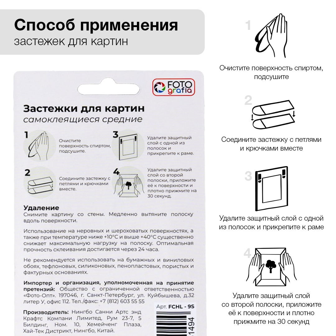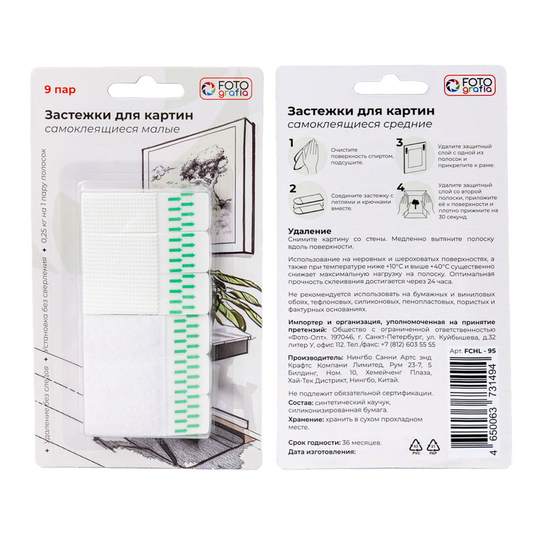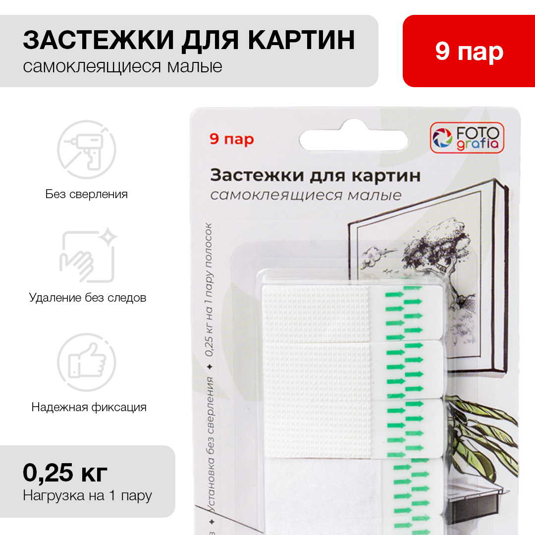 Клейкие застежки Fotografia с технологией бесследного удаления созданы специально для фоторамок, картин на холсте, плакатов. Также могут использоваться для крепления настенных часов, домофонов, роутеров и других небольших предметов. Они легко удаляются, не повреждая стены. Все предметы, зафиксированные настенными застежкам, можно легко снять и поменять местами. Максимальная нагрузка: 0,25 кг на 1 пару полосок. В комплекте 9 пар полосок.