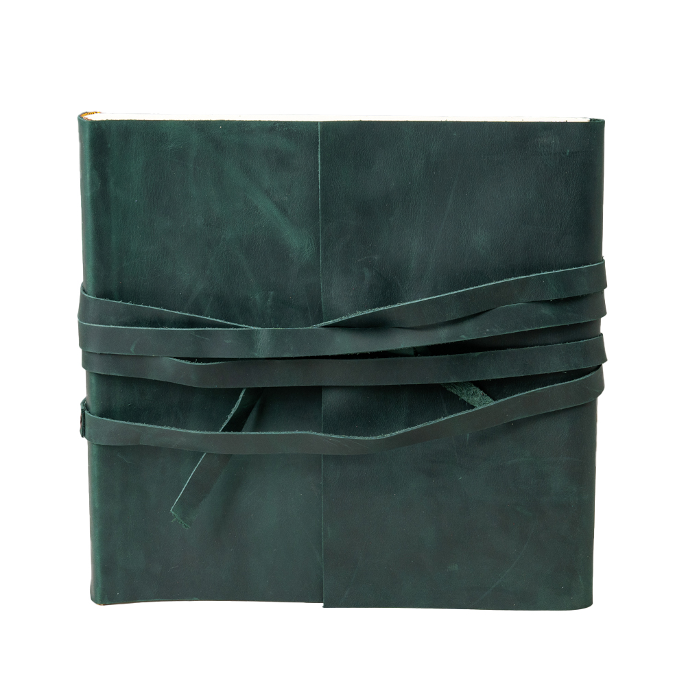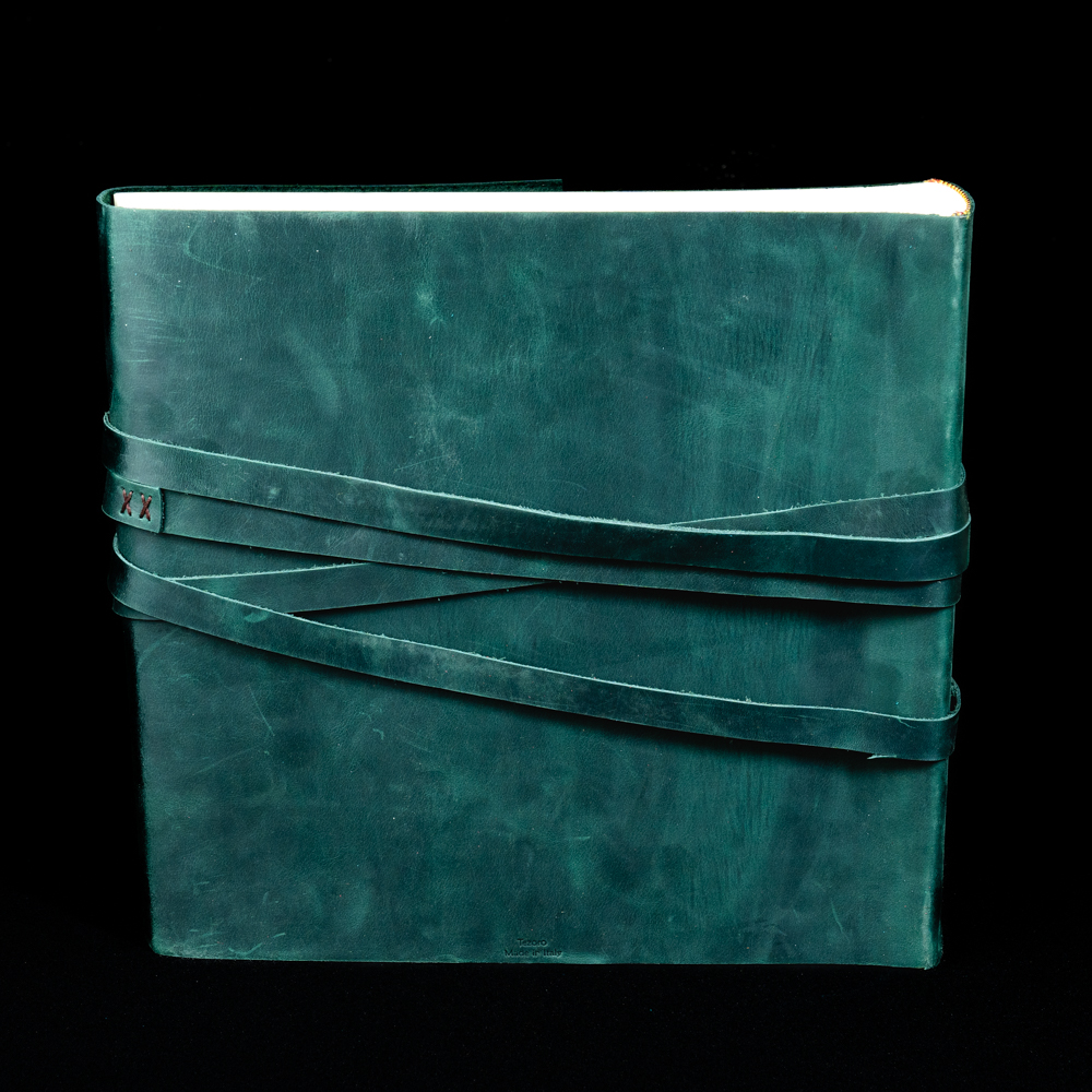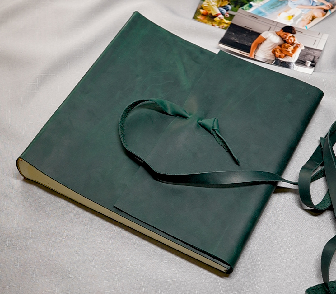 Премиальный традиционный фотоальбом ручной работы с обложкой из натуральной кожи в зеленом цвете. Фотоальбом формата 30см на 30см. Внутри фотоальбома - классический блок. Картонные листы проложенные пергаментом (калькой), которые не дают фотографиям соприкасаться друг с другом и слипаться. Фотография размещаются либо на уголки либо на двухсторонний скотч. Сделано в Италии.