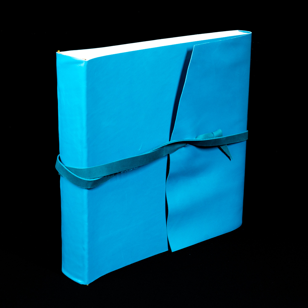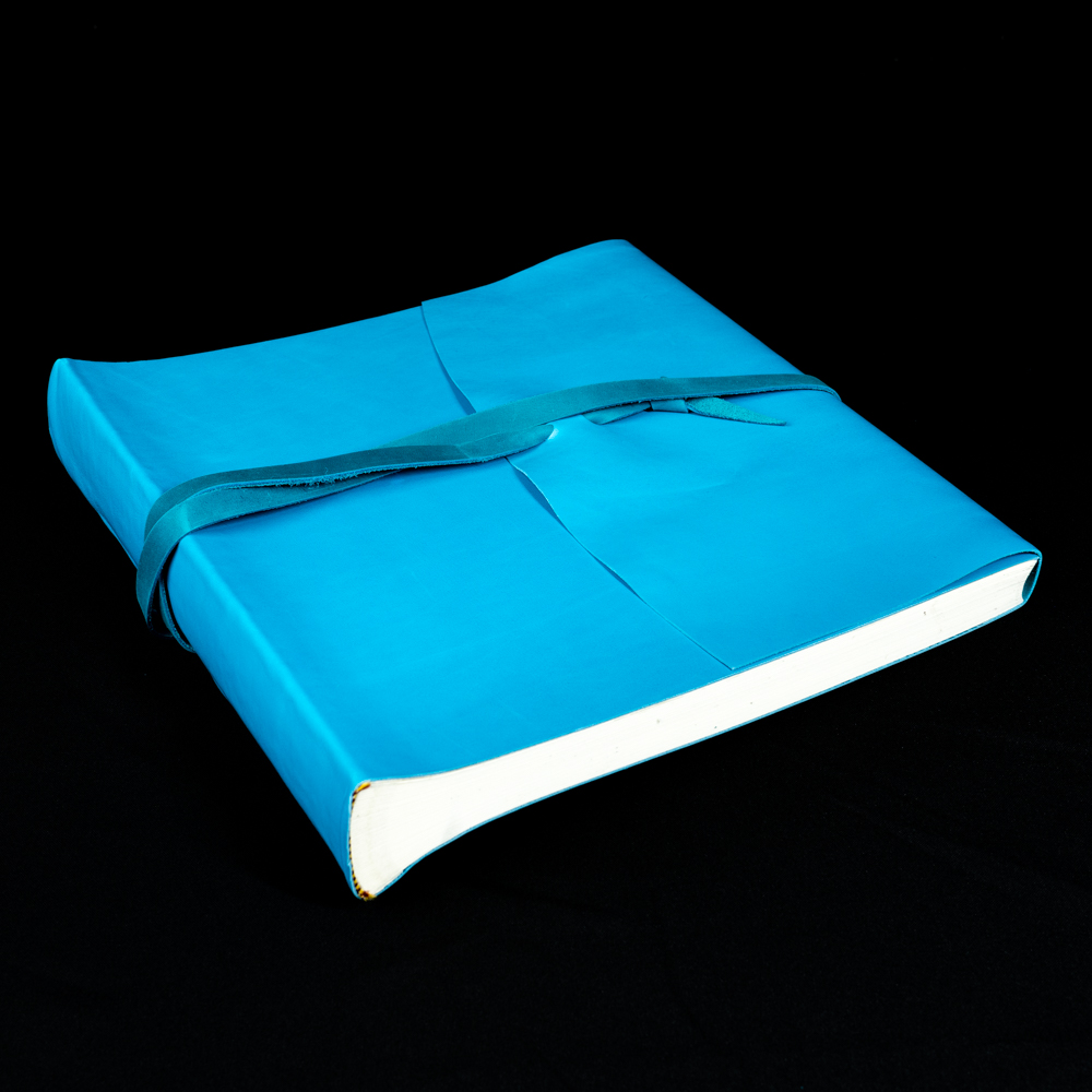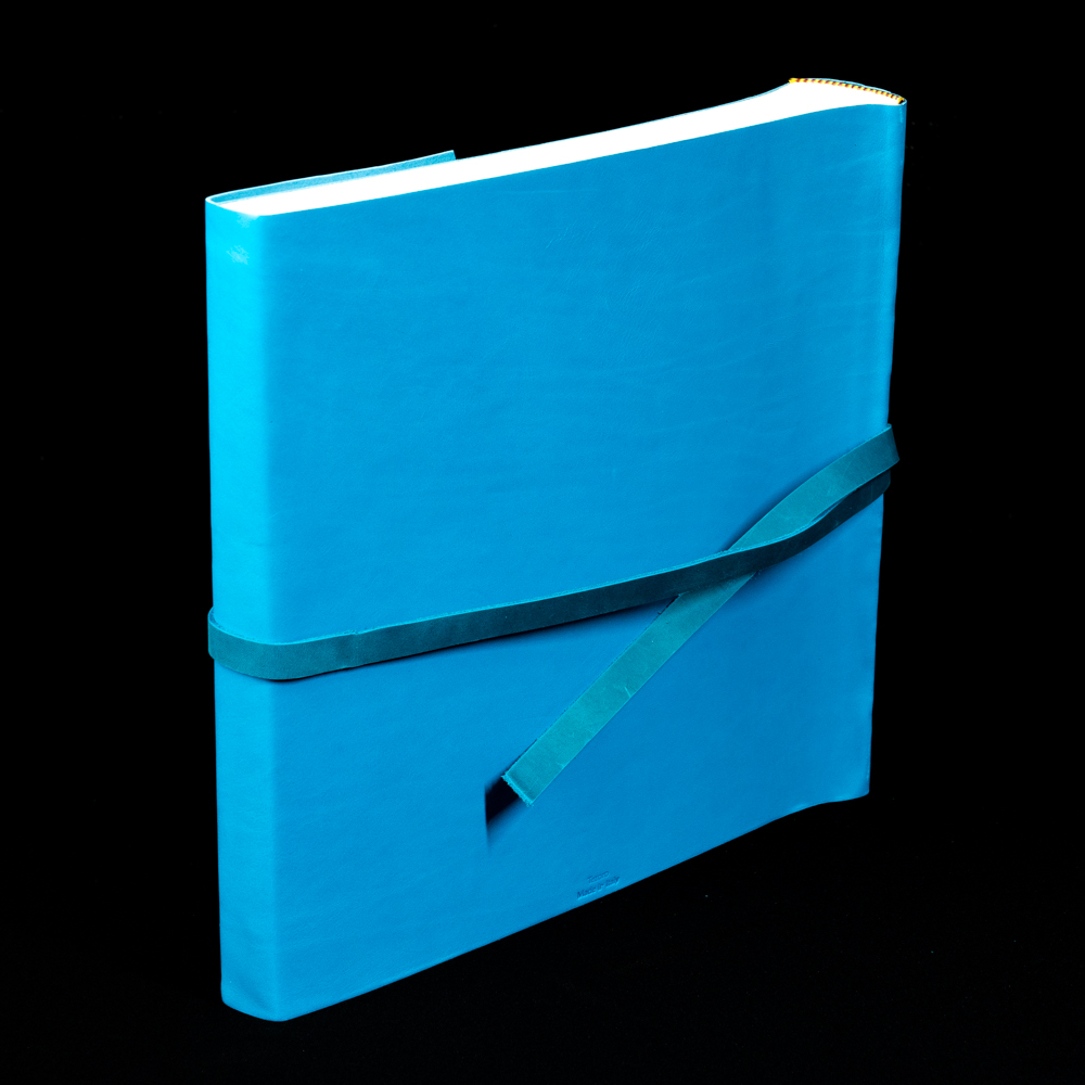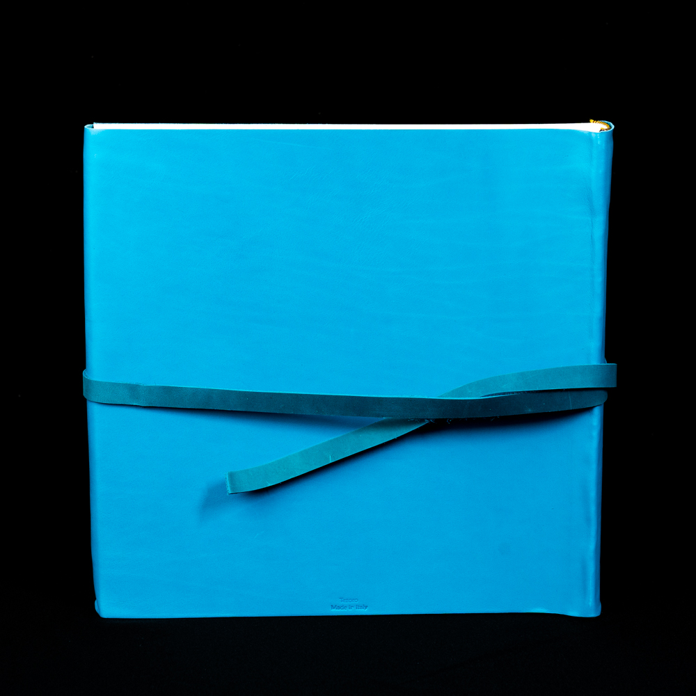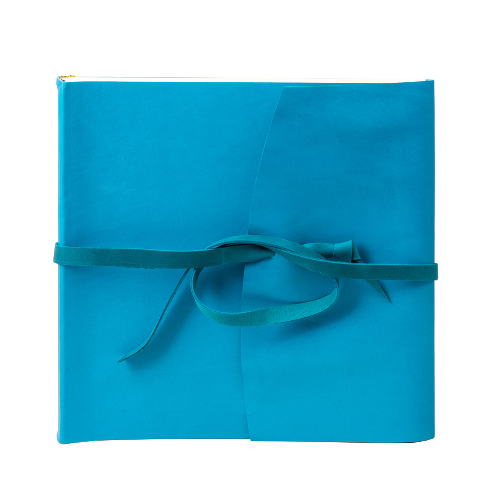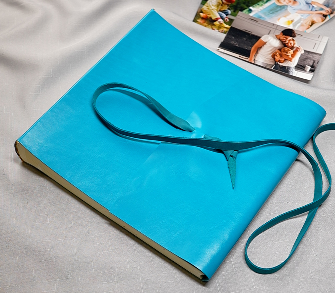 Премиальный традиционный фотоальбом ручной работы с обложкой из натуральной кожи в бирюзовом цвете. Фотоальбом формата 30см на 30см. Внутри фотоальбома - классический блок. Картонные листы проложенные пергаментом (калькой), которые не дают фотографиям соприкасаться друг с другом и слипаться. Фотография размещаются либо на уголки либо на двухсторонний скотч. Сделано в Италии.