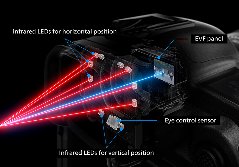 С автофокусом связана и еще одна уникальная для Canon функция: Eye-control AF, то есть выбор точки фокусировки с помощью движения глаза. Данная функция была представлена в EOS R3, а теперь вышло второе поколение, которое (по заявлению Canon) работает в 2 раза точнее. Выглядит это примерно так: внутри видоискателя по периметру располагаются инфракрасные светодиоды подсветки, а внизу – специальный сенсор с разрешением 307 000 точек, который и определяет, в какую часть кадра смотрит ваш глаз. При полунажатии на спуск рамка автофокуса переносится в эту область. Насколько эффективно это будет работать на самом деле – еще предстоит узнать, но звучит заманчиво – в особенности для съемки ситуаций, которые развиваются стремительно.