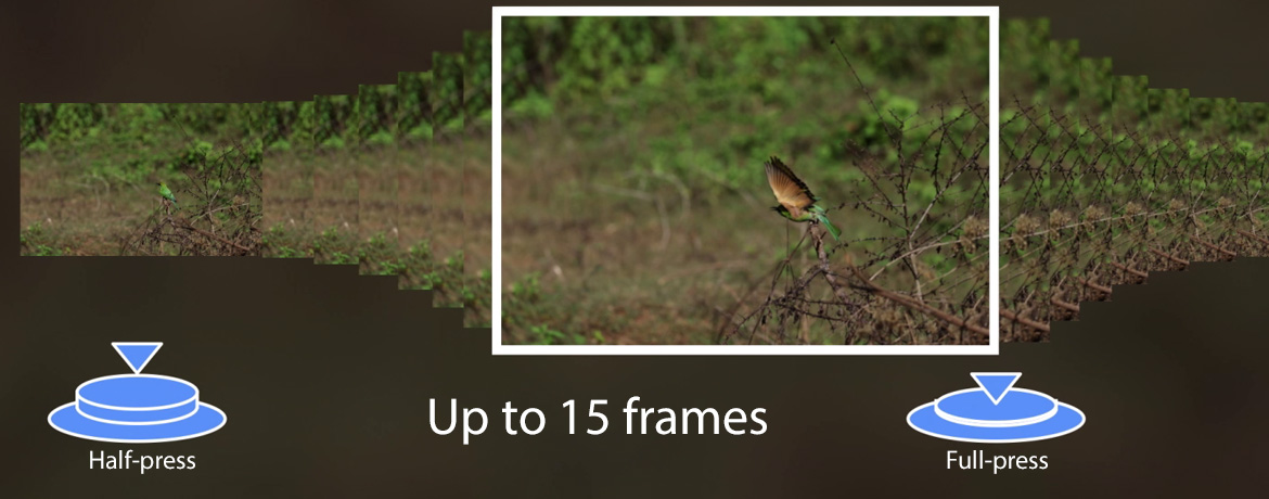 - Предзапись 0.5 с (20 кадров) до нажатия на спуск (JPEG и RAW), 3 / 5 с для видео