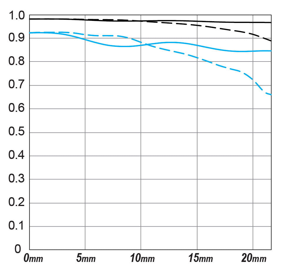 Что касается оптики, то всего в схеме задействовано 18 элементов, объединенных в 13 групп, среди них 1 флюоритовый, 1 со сверхнизкой дисперсией (UD), 3 стеклянных асферических и 1 BR элемент. BR (Blue Refractive) – это появившийся совсем недавно новый тип линз, который таргетированно работает по коротковолновой (синей и фиолетовой) части видимого света, что позволяет лучше скорректировать хроматические аберрации. Три асферических GMo элемента подавляют бликовый эффект «комы» от точечных источников света (фонари ночного освещения, звезды) и обеспечивают исключительную четкость от края до края изображения. Судите сами, официальный график MTF: