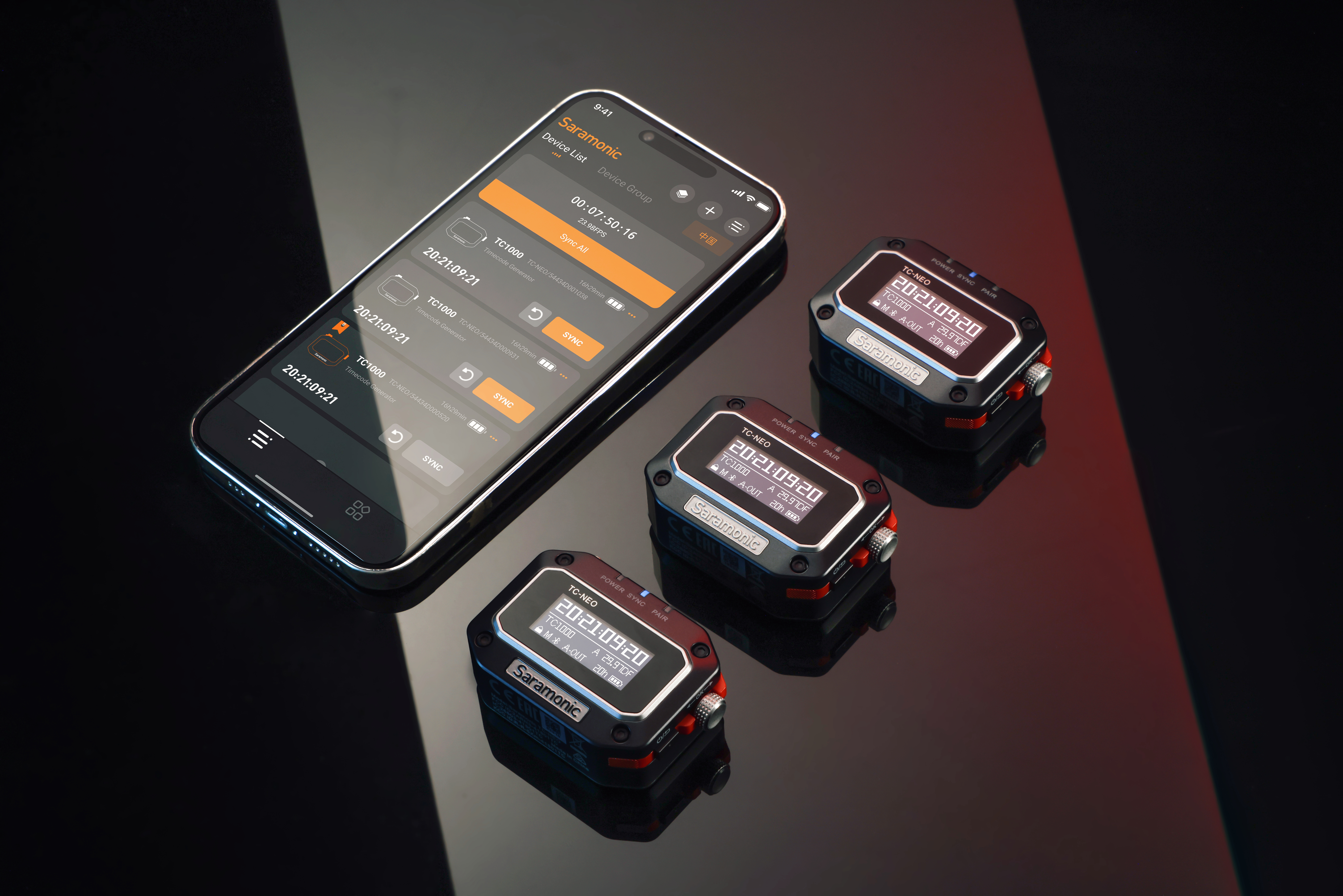 Вы можете подключить до 48 устройств TC-NEO к Saramonic System — бесплатному приложению для телефонов, которое позволяет синхронизировать временной код на всех устройствах одним нажатием кнопки «Синхронизировать всё».